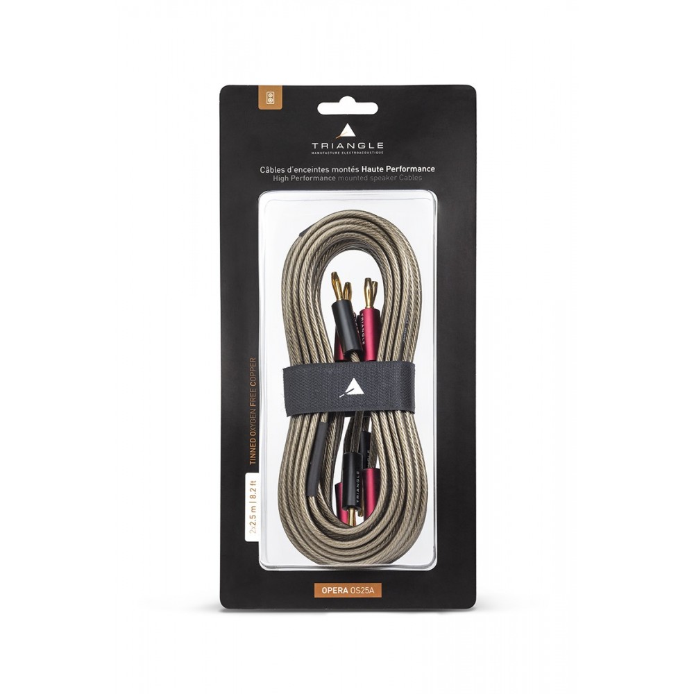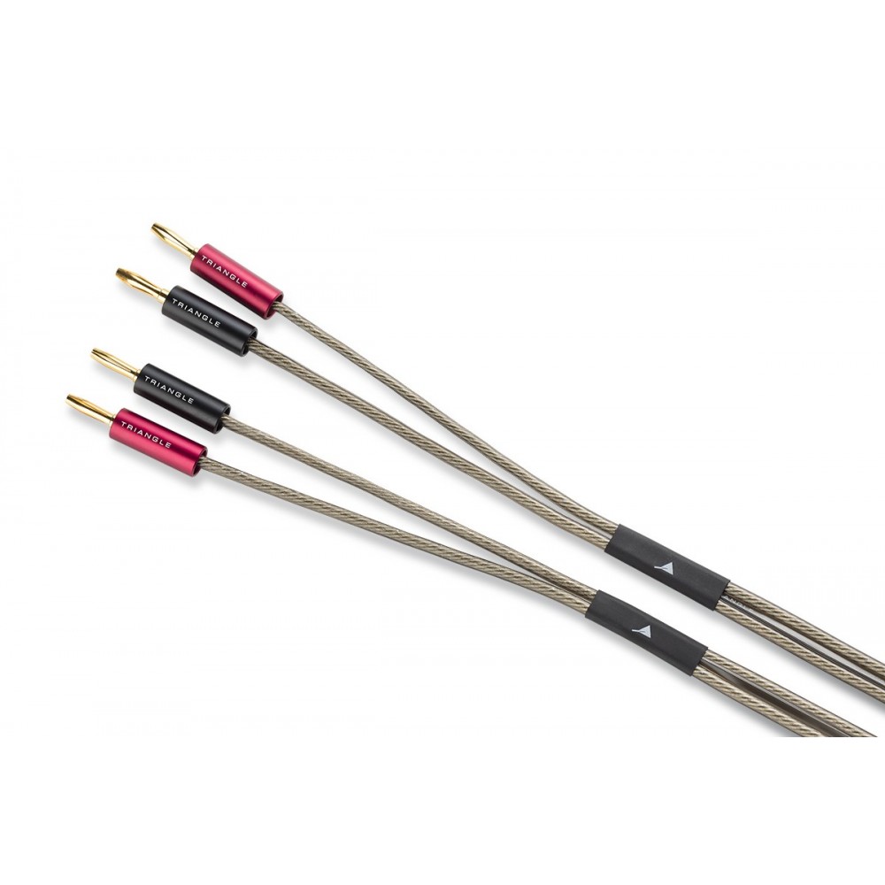 Høyttalerkabel fra den franske høyttalerprodusenten Triangle. Kablene kommer ferdig terminert med bananplugger og hvert sett har to kabler på 2,5 meter. Lederne har tversnitt på 2,5 mm2 og er laget av kobber med svært høy renhet. Disse er videre tinnbelagt for å sikre mot korrodering og oksidasjon.