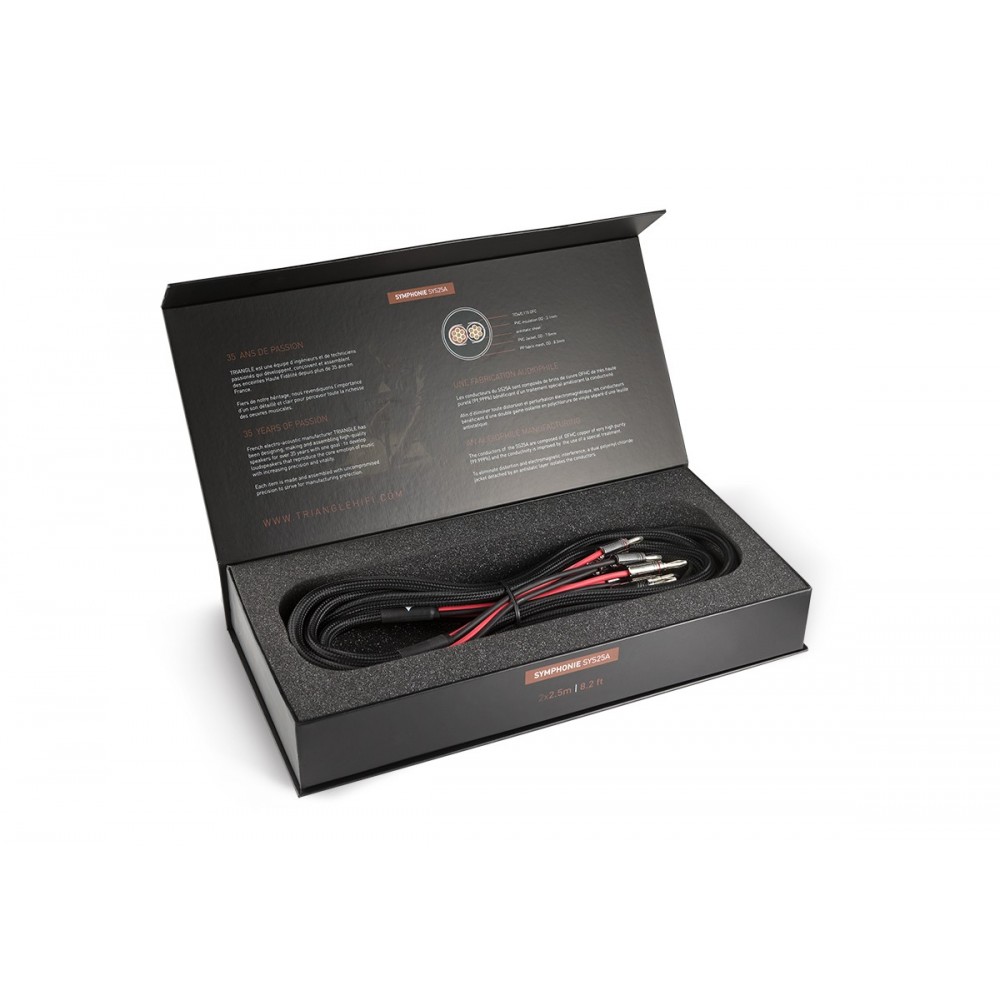 Den beste høyttalerkabelen fra den franske høyttalerprodusenten Triangle. Kablene kommer ferdig terminert med bananplugger og hvert sett har to kabler på 2,5, 3 eller 5 meter. Lederne har tverrsnitt på 2,5 mm2 og er laget av kobber med svært høy renhet. Kablene er videre dobbeltisolert og kommer med kabelstrømpe av tekstil.