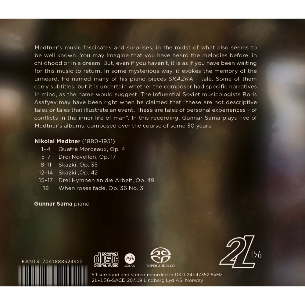 Medtners musikk fascinerer og overrasker i det som synes velkjendt. Du fornemmer at du har hørt melodiene tidligere, i barndommen eller i en drøm, men selv om du ikke har det, er det som om du har ventet på at denne musikken skulle vende tilbake. På magisk vis fremkaller det minner om noe uhørt. Medtner kalte mange av sine klaverstykker for SKAZKA – eventyr. Noen av dem har undertitler, men det er uvisst om komponisten har hatt konkrete hendelsesforløp i tankene, slik navnet antyder. Den innflytelsesrike sovjetiske musikkforskeren Boris Asafjev hadde kanskje rett når han hevdet at «dette er ikke billedlige eventyr eller eventyr som illustrerer en hendelse. Det er eventyr om egne opplevelser – om konfliktene i menneskets indre liv». Her spiller Gunnar Sama fem av Medtners hefter med klaverstykker, komponert over et tidsrom på 30 år.