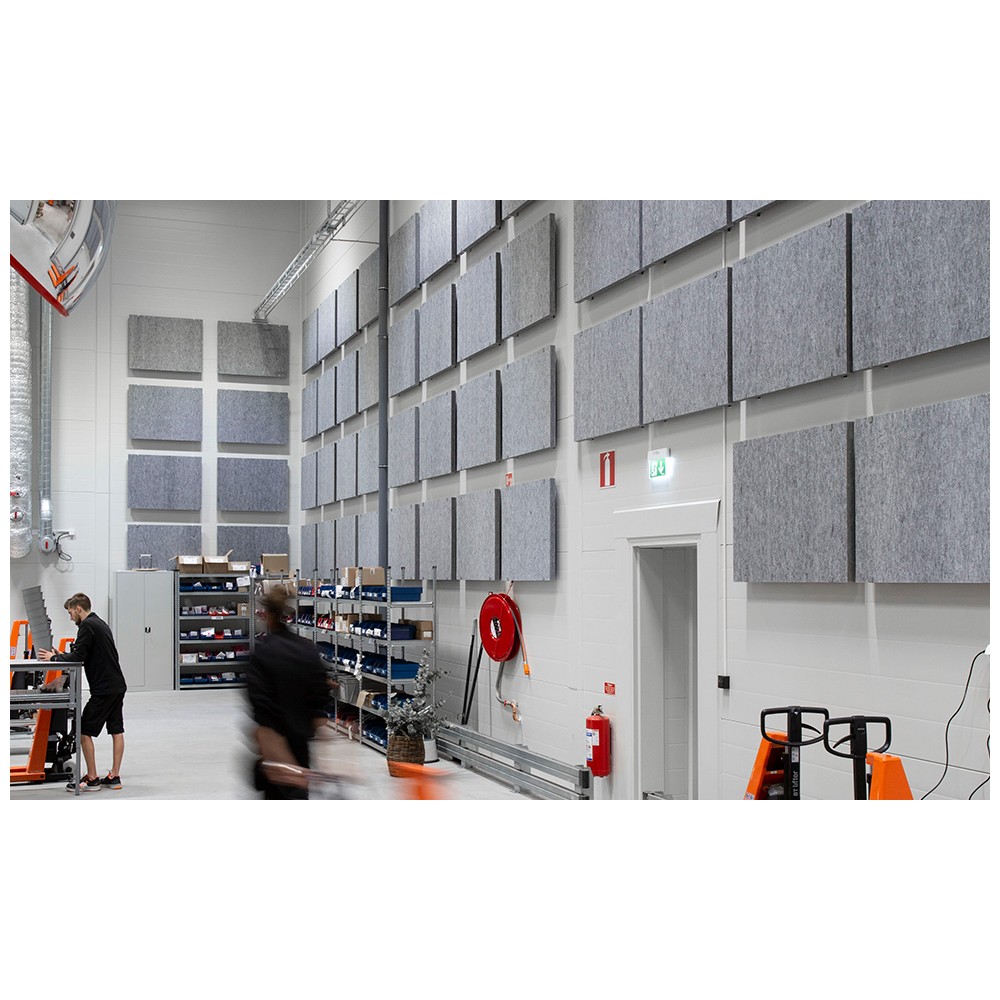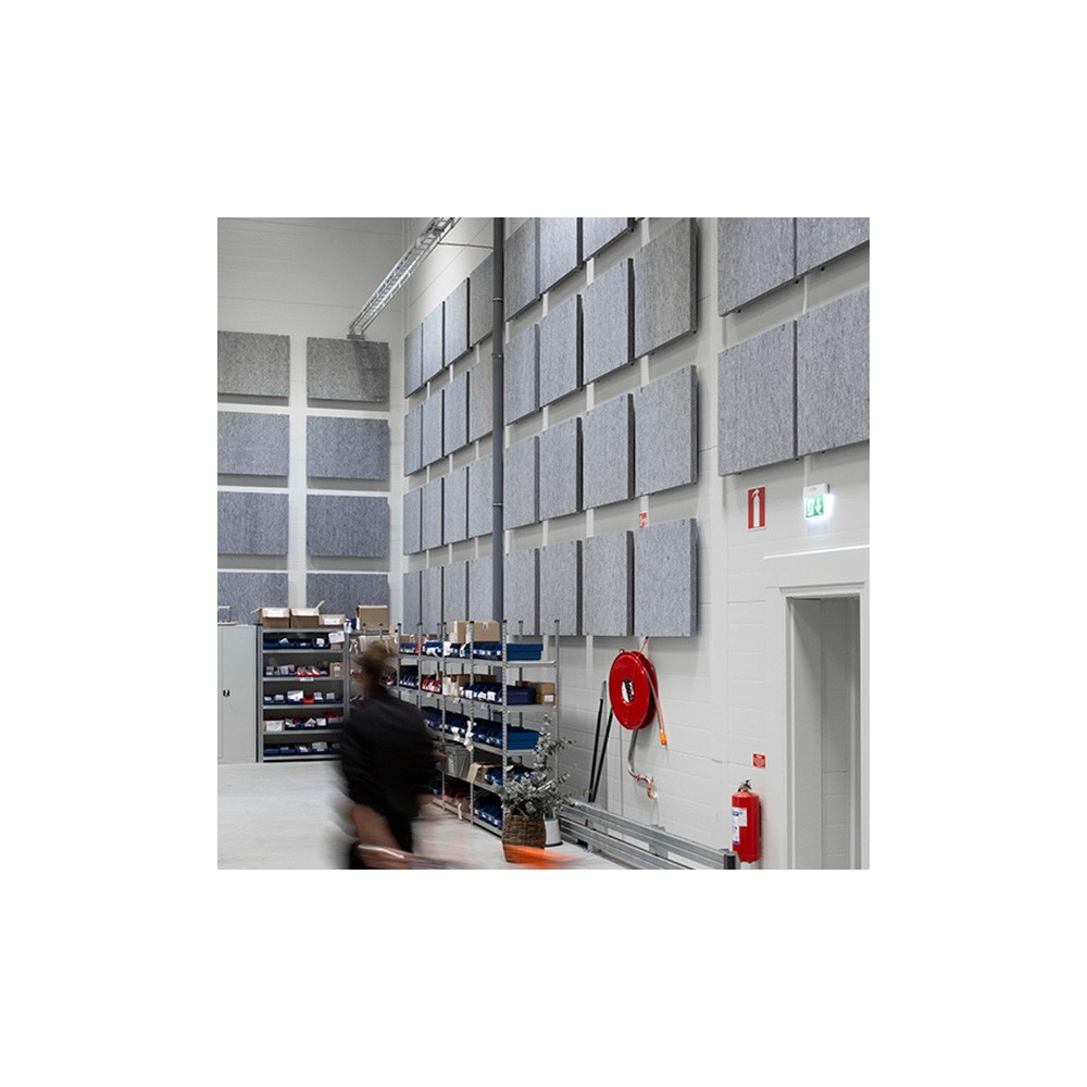 Lett har tykkelse 50 mm og monteres enkelt med bøyler (tilbehør), lim (TEC7 eller tilsvarende), eller med bolt og skive. Bøylene ligger som egen vare her i nettbutikken og du kan velge mellom fargene hvit, sort og sølv. Vi har to forskjellige bøyler tilgjengelig: Én variant for plate helt inntil vegg, og én variant som gir 50 mm luftspalte mellom vegg og absorbent. Med luftspalte vil platen absorbere enda mer lydenergi. Platene har ikke borrelåsbakside slik som en del av våre øvrige varianter.