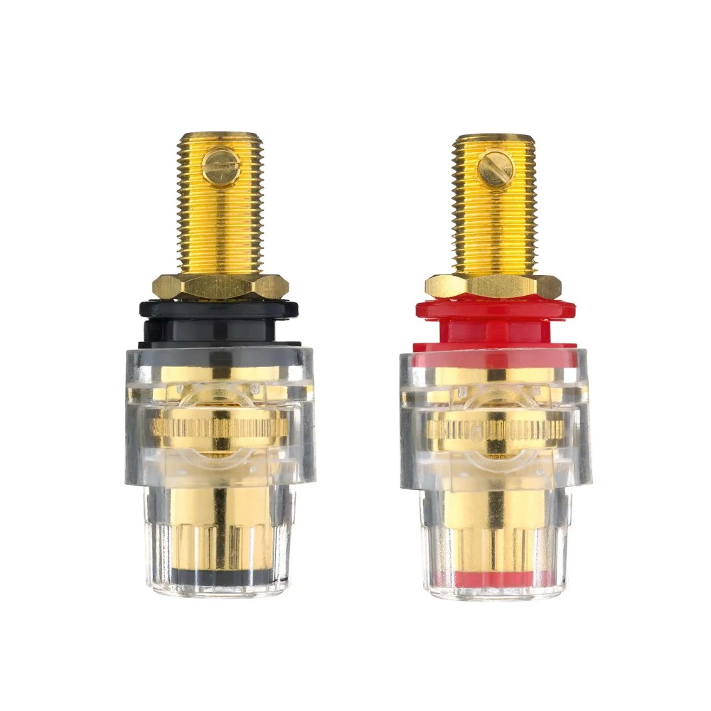 Høyttalerterminaler for selvbygg eller reparasjon. Pris per par med én sort og én rød terminal. Terminalene er fra tyske Inakustik sin Excellence-serie og har veldig god kvalitet. Produsert i gullbelagt kobber. Terminalene er tilpasset standard bananplugger og spader, samt vanlig direkte skrufeste. M8 med 8 mm diameter borrehull.